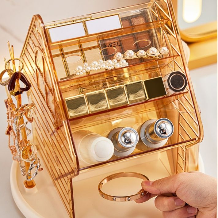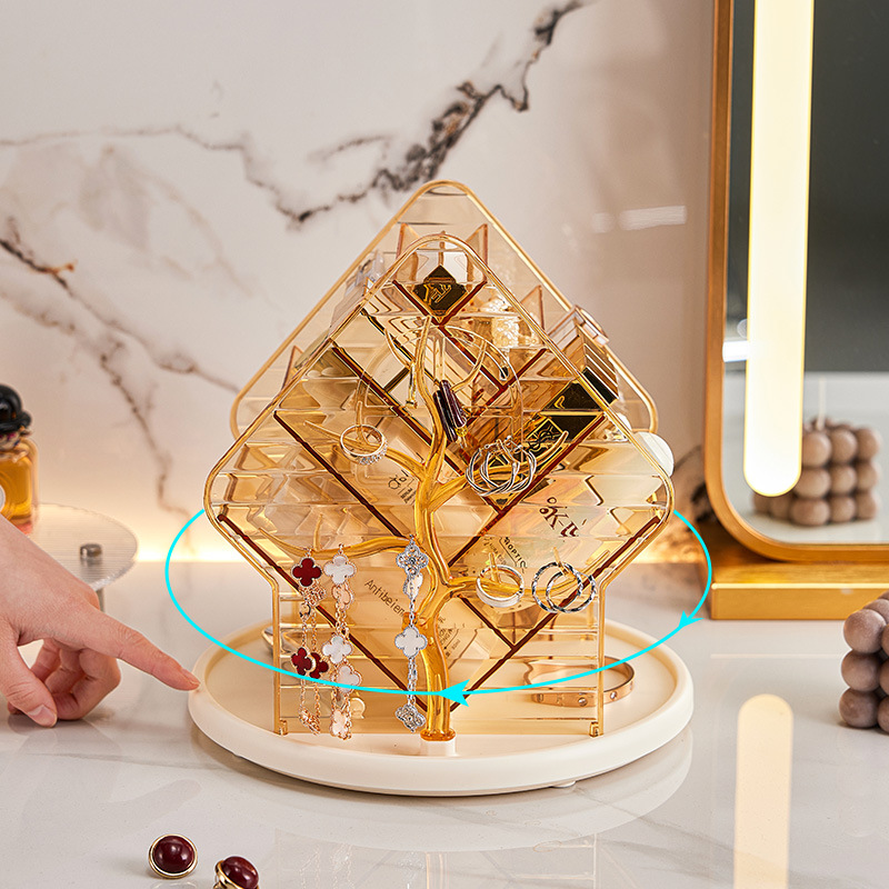 化粧品とアクセサリーをまとめて収納できるメイク ボックス 透明タイプの多機能収納ケースです。 回転式の台座で360度どの角度からも取り出しやすく、立体的な仕切り構造で口紅やネックレス、指輪などを見やすく整理できます。 透明素材なので中身が一目で分かり、毎日のメイクやおしゃれを楽しくサポートします。 メイクボックスとしてだけでなく、小物入れとしても活躍する便利なアイテムです。