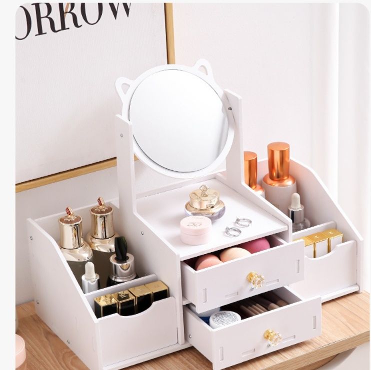 デスクの上で使える便利なメイクボックスです。 回転式の鏡が付いており角度調整も自由自在で、メイク ボックス 白のカテゴリの中でも特に機能性に優れています。 二段の引き出しには化粧品をたっぷり収納でき、サイドの仕切り付き収納スペースには化粧水やリップなどを立てて整理整頓できます。 コンパクトながら大容量で、毎日のメイク時間を快適にサポートする収納ボックスです。