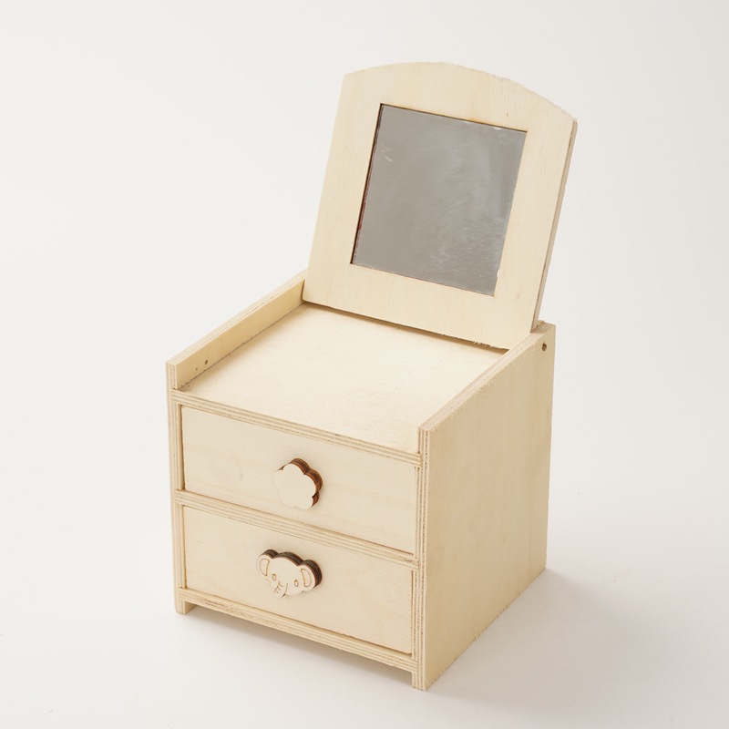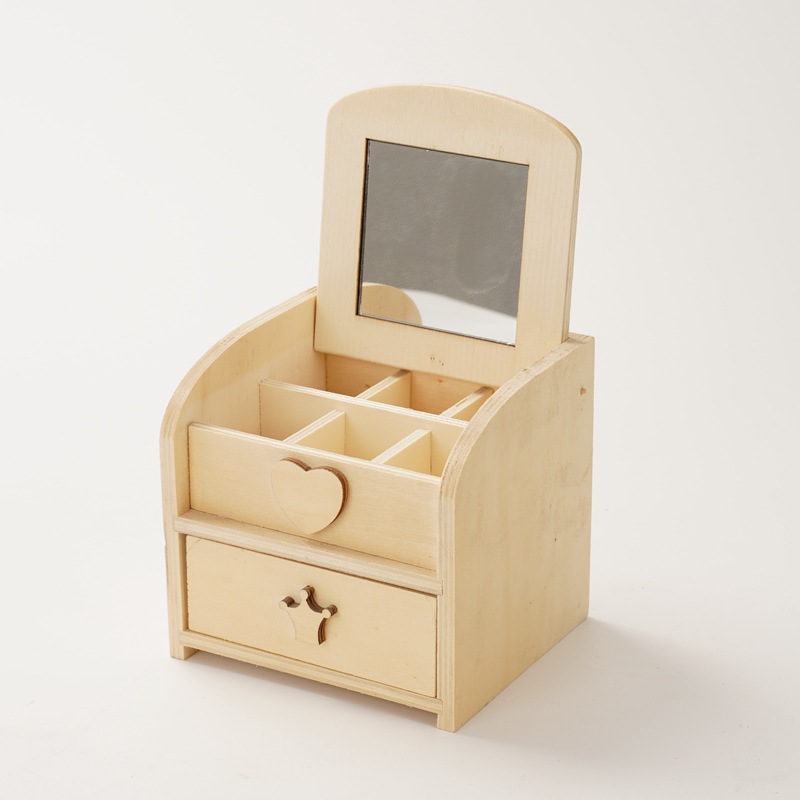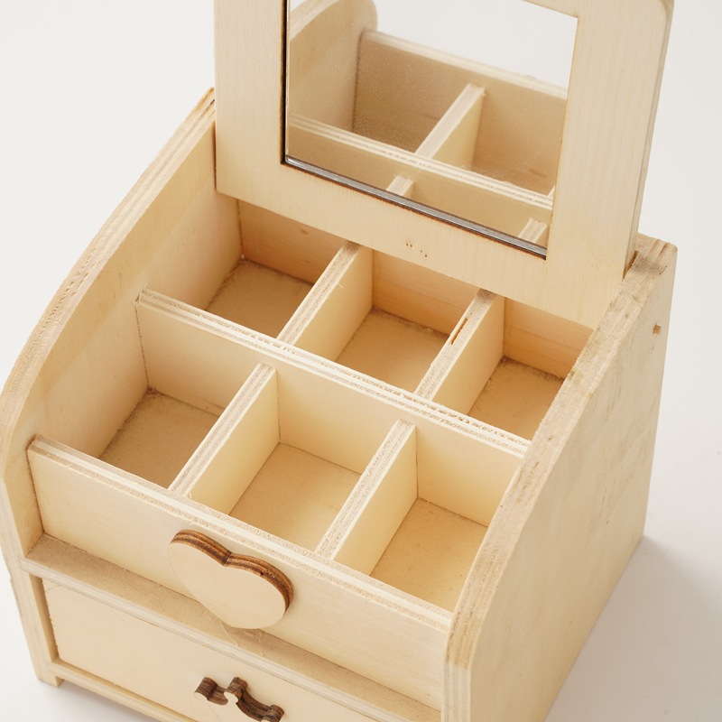 天然の木材を使用したメイク ボックス 木製です。 上段には鏡と仕切り付き収納スペース、下段には引き出しを備えた多機能設計で化粧品やアクセサリーをすっきり整理できます。 可愛らしい月型の取っ手がアクセントになっており、インテリアとしても楽しめるメイクボックスです。 ナチュラルな木の温もりが感じられ、毎日の身支度を優雅な時間に変えてくれる収納アイテムです。