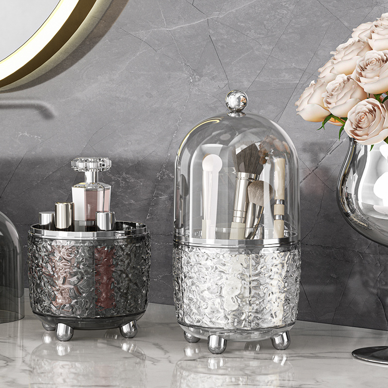 メイクボックスとして最適な透明ドーム蓋付きの収納ケースです。 中身が一目で確認できるメイク ボックス 透明タイプで、メイクブラシや化粧道具をおしゃれに収納できます。 底部には華やかな立体模様が施され、インテリアとしても美しく飾れます。 取り外し可能なドーム蓋でほこりからしっかり守り、清潔に保管できます。 仕切り付きで整理整頓しやすく、ドレッサーや洗面台を上品に演出します。