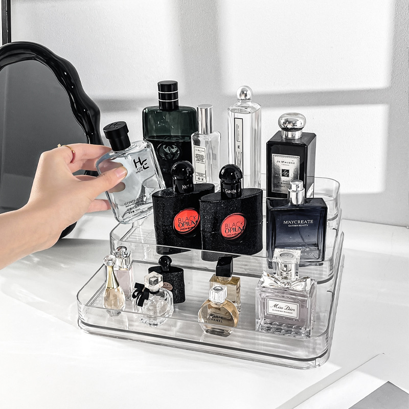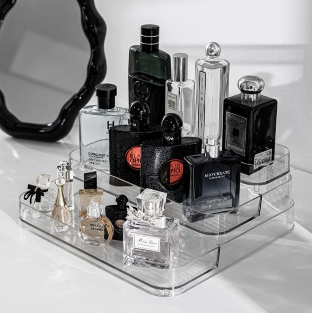 香水やコスメを美しくディスプレイできるメイク ボックス 透明タイプの回転式収納トレーです。 透明なアクリル素材で中身が一目で確認でき、段差のある構造で高さのあるボトルも効率的に収納できます。 台座が回転するため奥の商品も取り出しやすく、毎日の身支度がスムーズになります。 メイクボックスとして洗面台やドレッサーに置けば、お気に入りの香水コレクションをおしゃれに整理整頓できます。