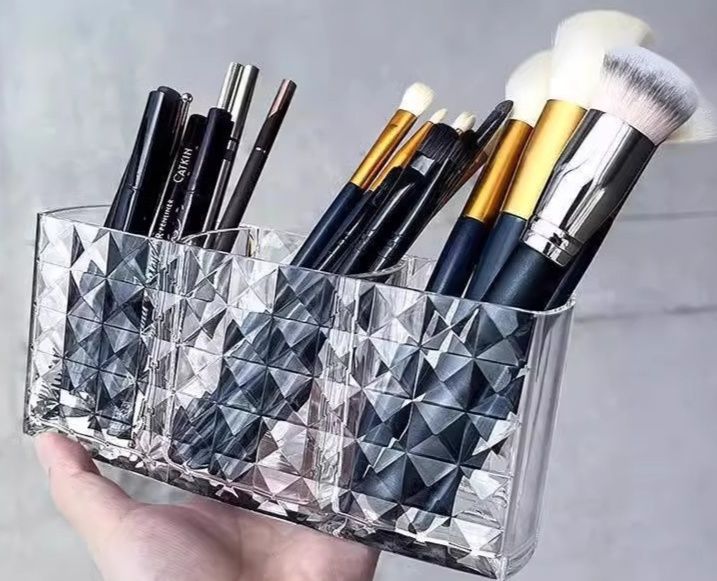 メイク ボックス 透明の定番アイテムとして人気の化粧品収納ケースです。 美しいダイヤモンドカット模様が施された透明アクリル製で、ブラシや口紅、マスカラなどを一目で確認できます。 三つの仕切りスペースで化粧道具を種類別に整理でき、毎日のメイク時間を快適にします。 メイクボックスとして洗面台やドレッサーに置いても場所を取らず、機能性と美しさを兼ね備えた収納アイテムです。
